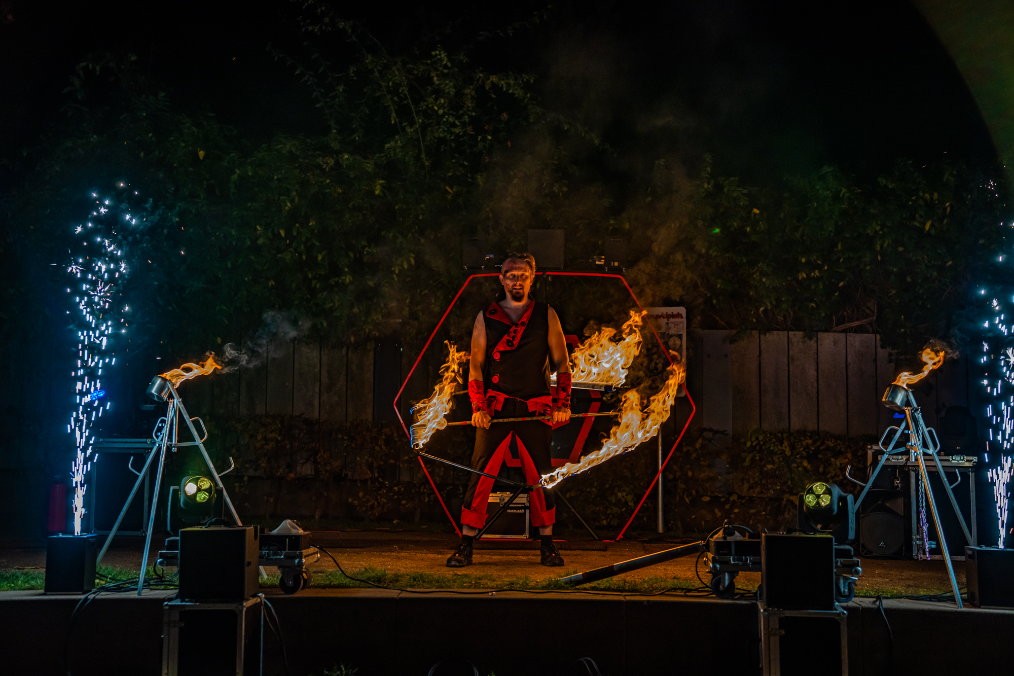 Bei all meinen Feuershows ist die komplette Veranstaltungstechnik bereits enthalten – von der perfekten Beleuchtung bis hin zur kraftvollen Beschallung. Sie profitieren von einem stressfreien Ablauf und können sicher sein, dass die Show in bestmöglicher Qualität präsentiert wird – ohne zusätzlichen Aufwand, aber mit maximaler Wirkung!