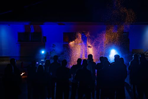 Besonders herausfordernd war die sensible Location: Der Untergrund musste trotz intensiver Effekte sauber und unversehrt bleiben. Durch sorgfältige Planung, speziell abgestimmte Materialien und eine gründliche Nachbereitung mit Industriestaubsauger konnte ich garantieren, dass nach dem letzten Funken kein Rückstand blieb. So stand der beeindruckenden Show nichts im Wege – sicher, kontrolliert und professionell umgesetzt.