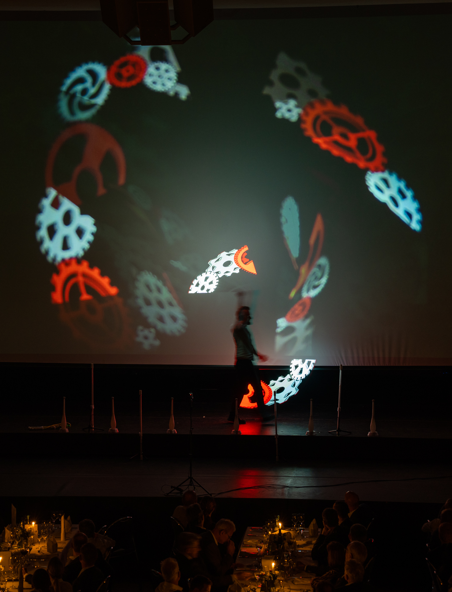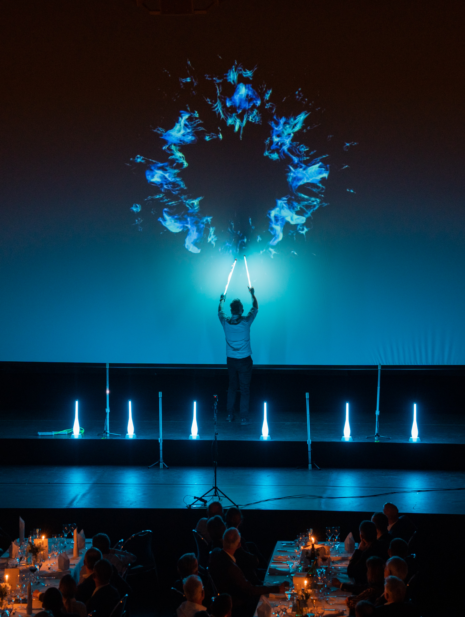 Ich zeichne mit Licht. In meiner Show Live Light verschmilzt moderne LED-Jonglage mit großflächigen Video-Projektionen zu einem einzigartigen Erlebnis. Während ich vor der Leinwand jongliere, verwandeln sich meine Bewegungen durch Kameras und Effekte live in leuchtende Bilder – wie gemalt aus Licht.